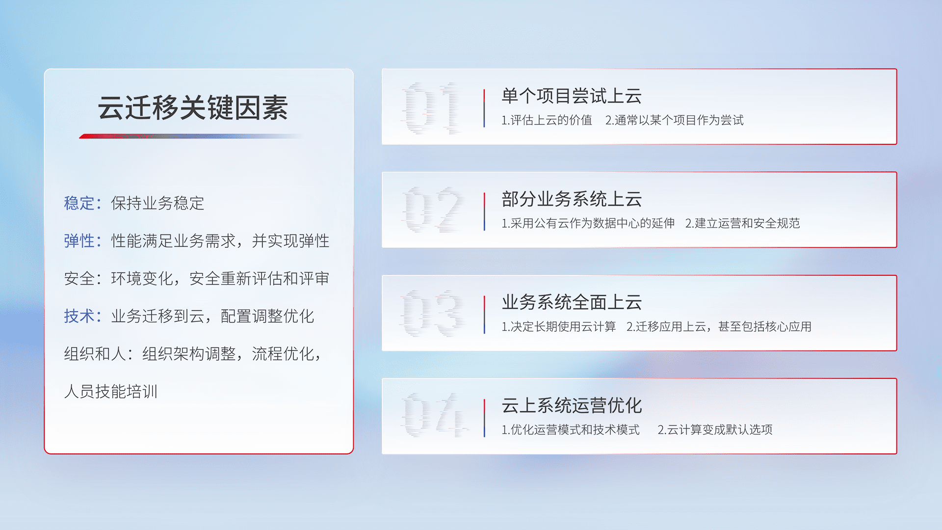 结合实际业务,,从规划设计、、、云平台选型、、、云原生改造、、数据迁移、、集成交付,,,迁移全过程为客户识别最佳上云路径,,,,做好风险识别管理,,设计网络架构、、、身份权限、、安全审计合规、、操作审计、、日志审计、、、、监控告警策略、、多站点容灾设计等,,,,对云上基础设施进行整体规划,,提升IT治理水平,,,,以满足弹性、、高可用、、、、高性能的需求。。
